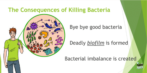 Killing bacteria always has consequences. The biggest consequence is the formation of something called biofilm.